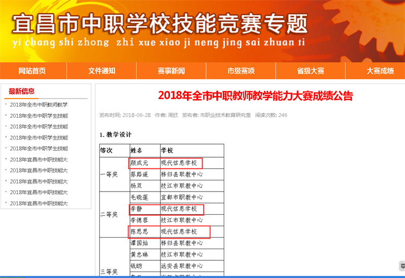 2018年6月25日至26日,宜昌市教育局主办的中职学校教师教学能力大赛中,共有来自全市12所中职学校的63名优秀教师、领队参加了此次比赛(其中学校教师颜成元、陈思思、李静,领队副校长肖飞一行四人参赛)。