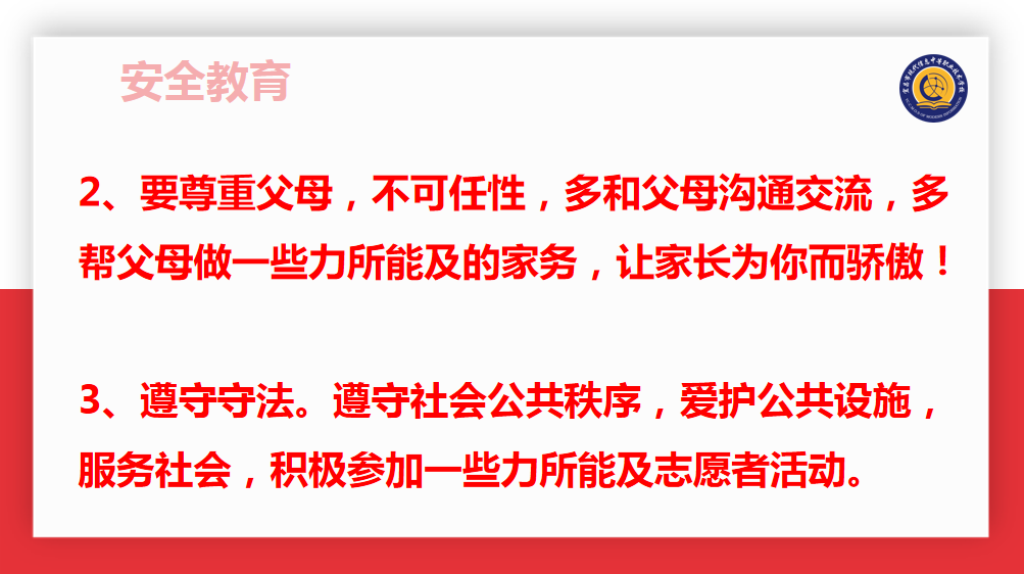 百善文明为先,万思安全重。安全是假期的重中之重。针对暑假安全问题,学生发展处向华主任重点强调假期在交通安全、防火防电、电信诈骗、饮食卫生等方面要注意的问题。学生要时刻加强安全意识,努力增强自我防范能力,做到警钟常鸣,安全永记心间,后祝愿每一位同学都快快乐乐度假,平平安安返校。