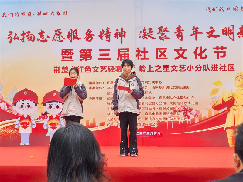 3月5日下午,校团委带领学生志愿者前往金巴岭社区协助开展以“弘扬志愿服务精神 凝聚青年文明新风尚”为主题的第三届社区文化节,此次文化节由我校2301班的邢居荣和2205班的陈雅萌主持,2211班的程园园、胡睿婕、李雨琦和韩思语进行开场大鼓的表演,不仅让居民们感受到现代学子的热情,也感悟到了雷锋精神的时代意义和精神价值。