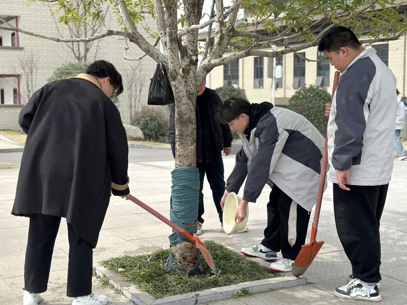 植树节当天天气晴朗,春风拂面。来自23级8个班,共计300多名师生积极地参与到了活动中来。首先是由校团委书记周亚姗对活动进行简短的讲解,随后各班级在当堂教师的带领下分组行动。大家热情高涨,分工明确,干劲十足。先挥锹松土,再拔草除杂,后浇水施肥,每一道工序都充满了热情与汗水。大家肩并肩、心连心,用实际行动让全校的树木焕然一新。