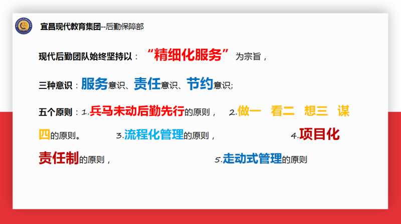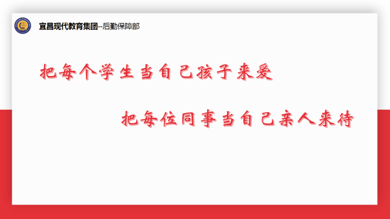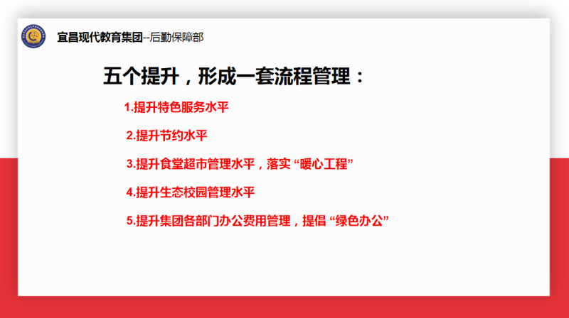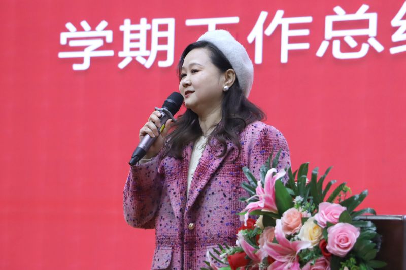 龚红艳以“总结赋能齐奋进,精进臻善再出发”为主题展开发言,围绕食堂、超市、保安、保洁、维修等后勤工作做了全方面总结,以一则短片展现了后勤人员一天的工作流程,他们“把每个学生当自己孩子来爱,把每位同事当自己亲人来待”的敬业态度赢得了热烈的掌声。同时,龚红艳将“五个提升”作为今后工作的重点,坚定将“服务、责任、节约”三种意识及“流程化、项目化、责任制”等五个原则贯穿到后勤工作始终的信念。