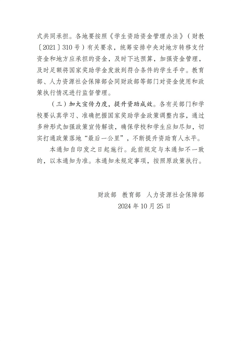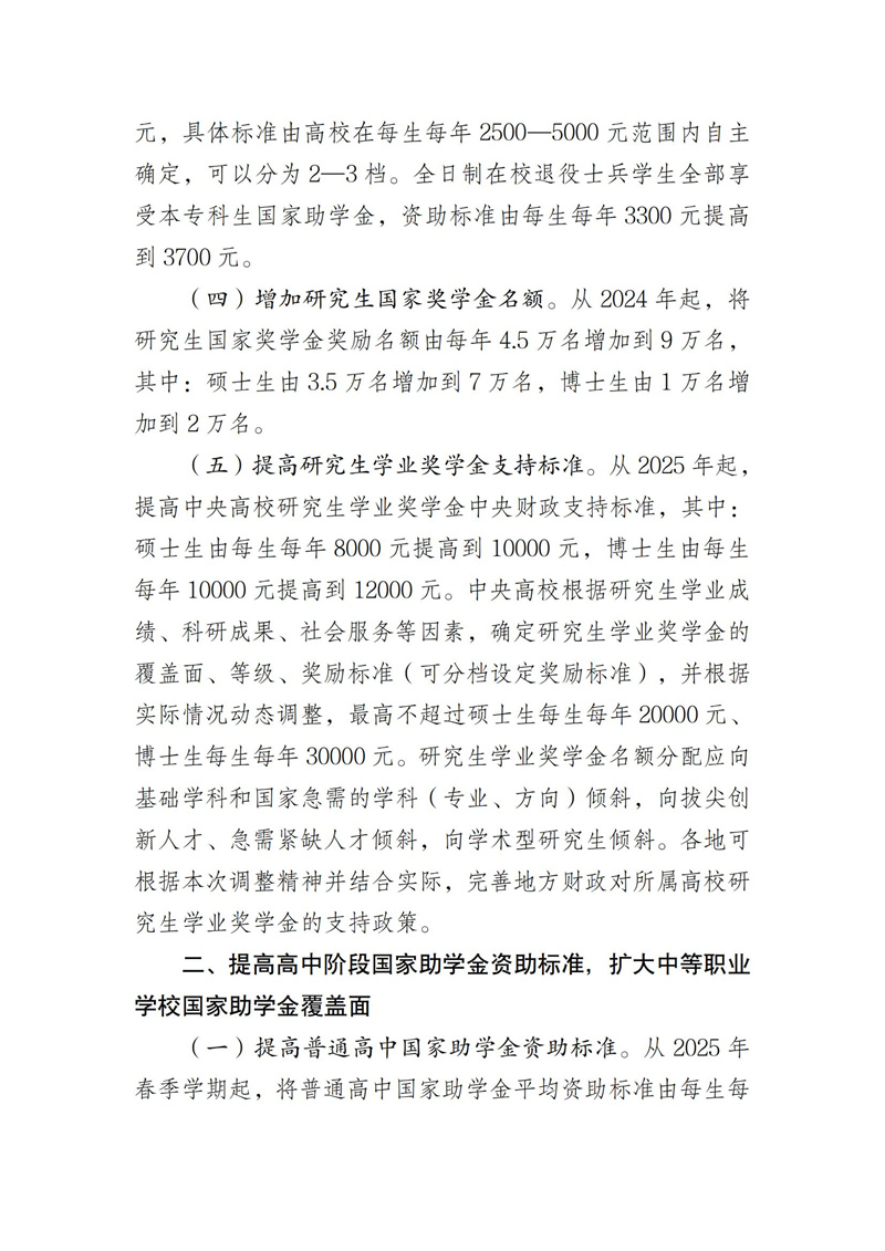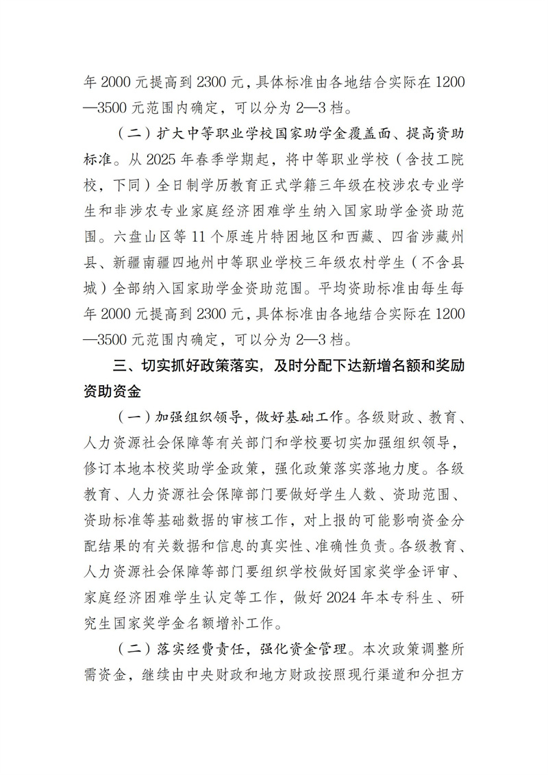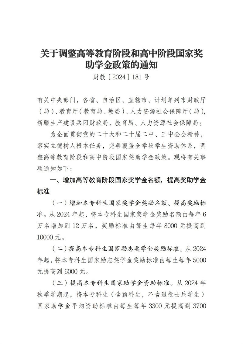 财教〔2024〕181号 关于调整高等教育阶段和高中阶段国家奖助学金政策的通知