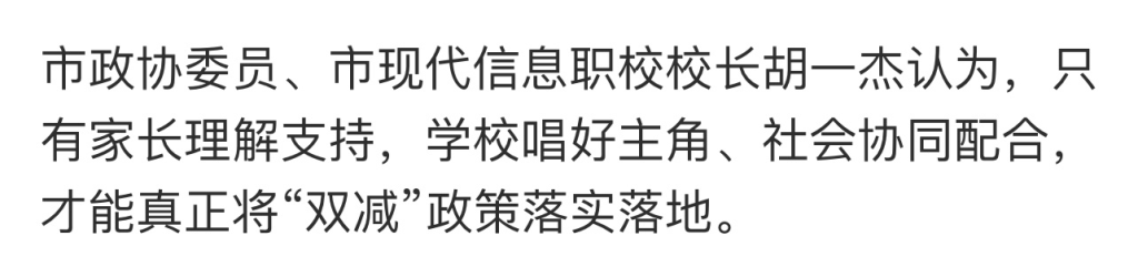 市政协委员、课题组成员、现代信息学校校长胡一杰发言从筑牢学校育人“主阵地”、补齐家庭教育“新短板”、促进培训机构“真转型”等方面表达了社会对双减工作的肯定与支持,也提出了进一步强化学校育人成效,落实课程改革和服务属性,努力营造社会各方关心关注教育,充分利用各方资源支持育人工作的良好氛围,联合构建“德育为先,五育并举,终身教育”的育人体系,只有家长理解支持,学校唱好主角、社会协同配合,才能真正将“双减”政策全部落地。