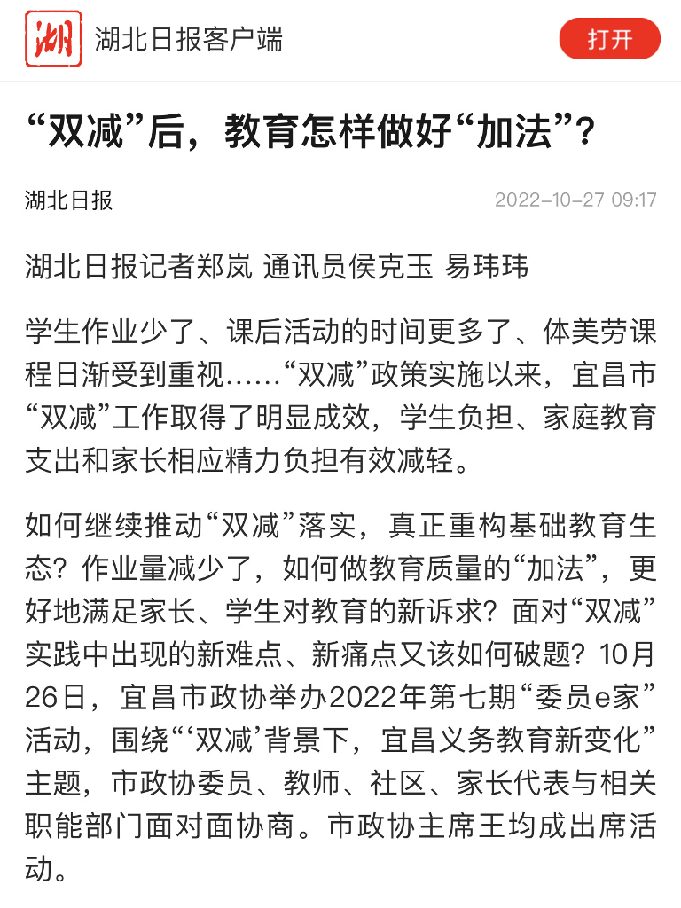市政府副秘书长孔亮到会听取意见建议。他表示,将以此次活动为契机,进一步精准施策、系统施治、融合施力,扎实做好“双减”后半篇文章,办好人民满意的教育,确保实现“学生及家长负担1年内有效减轻、3年内成效显著,人民群众教育满意度明显提升”的目标,为宜昌加快建设长江大保护典范城市作出教育贡献。