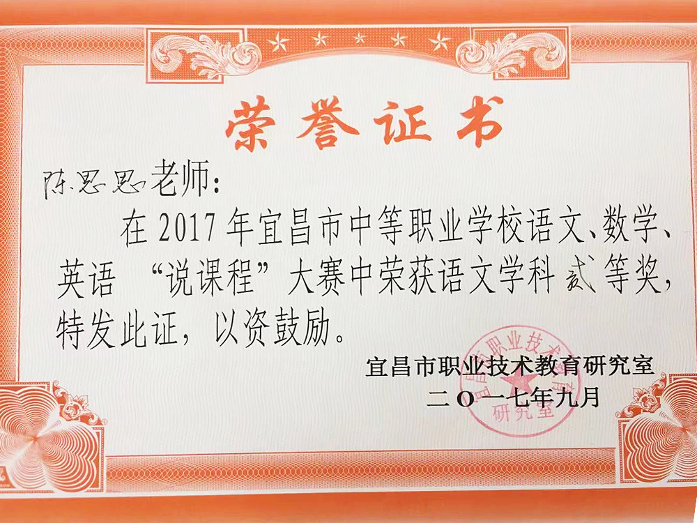 同学在2017年宜昌中职学校技能(才艺)大赛中荣获奖项