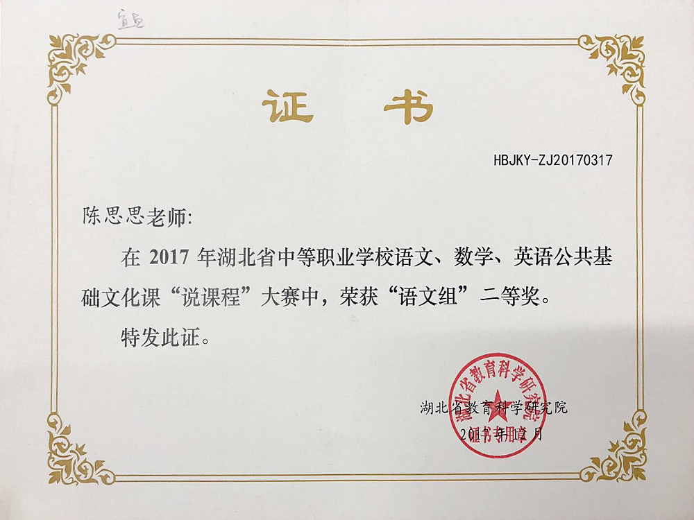 陈思思老师在2017年湖北省“说课程”大赛中荣获语文组二等奖
