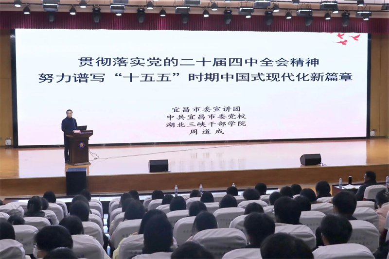 12月25日下午,由宜昌市人力资源和社会保障局主办的党的二十届四中全会精神首场宣讲活动,在宜昌市现代信息技工学校报告厅隆重举行。850余名师生代表及党员干部到场聆听,深入学习领会全会精神,凝聚奋进新征程、加快建设中国式现代化的思想共识与行动力量。