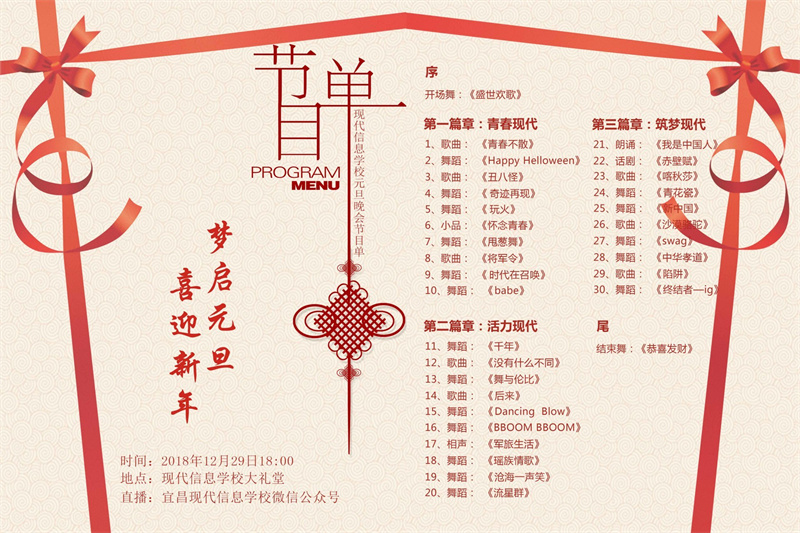 为丰富校园文化生活,推动校园精神文明建设,激励全体师生满怀激情,迈向新的一年,12月 29日下午,现代信息学校全体师生欢聚一堂,在大礼堂举办了2019年“飞扬青春,活力现代 筑梦2019”元旦晚会。