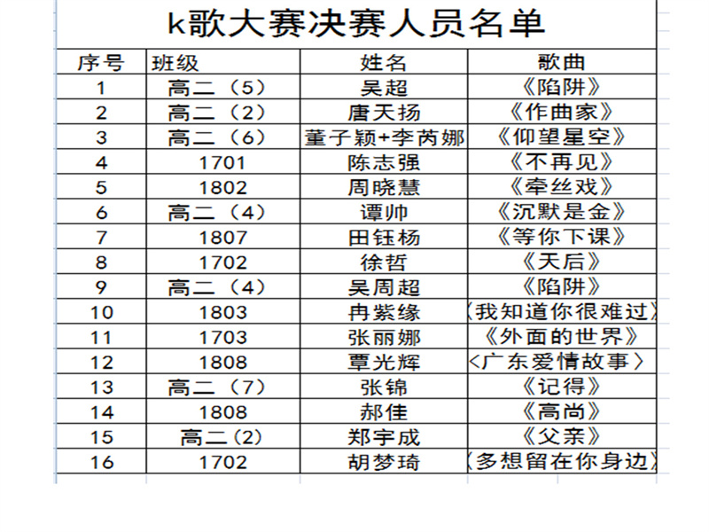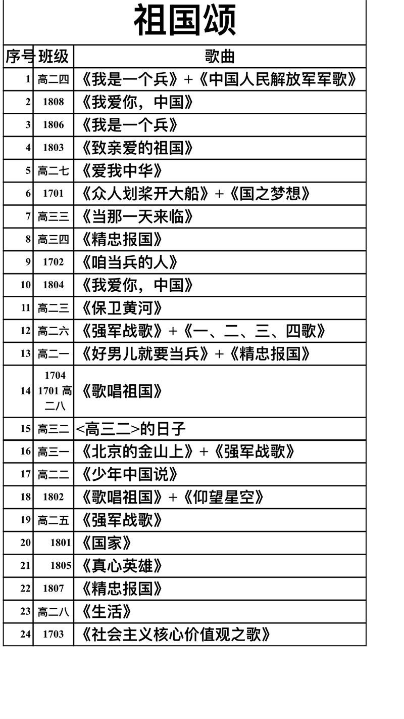 此次合唱比赛,不仅丰富了校园文化生活,激发了学生的爱国热情,而且锻炼了同学们的心理素质,增强了班级凝聚力,培养了集体荣誉感。(附合唱节目单)