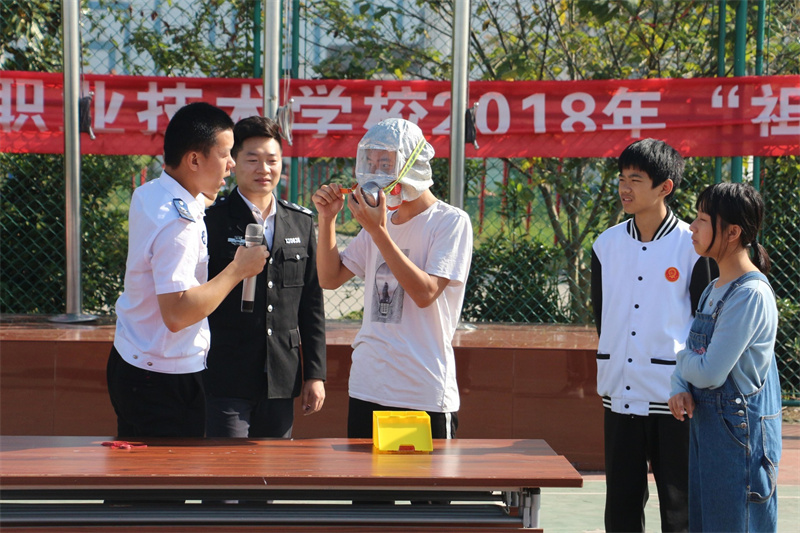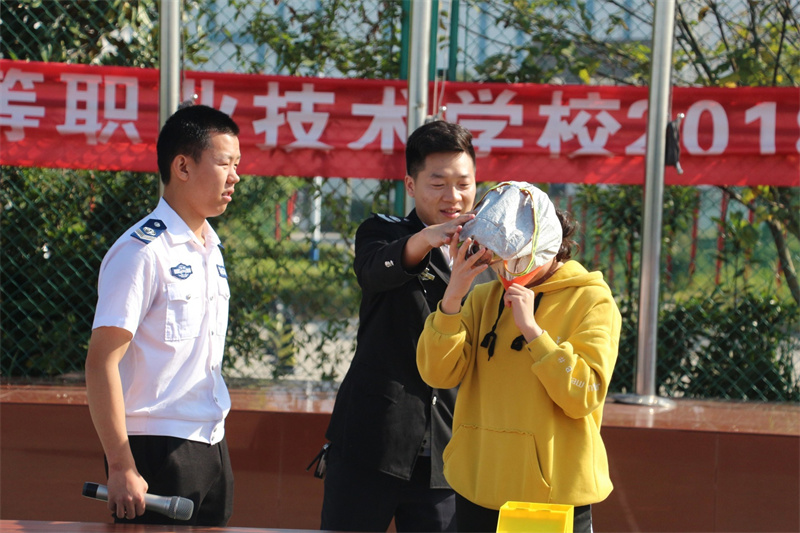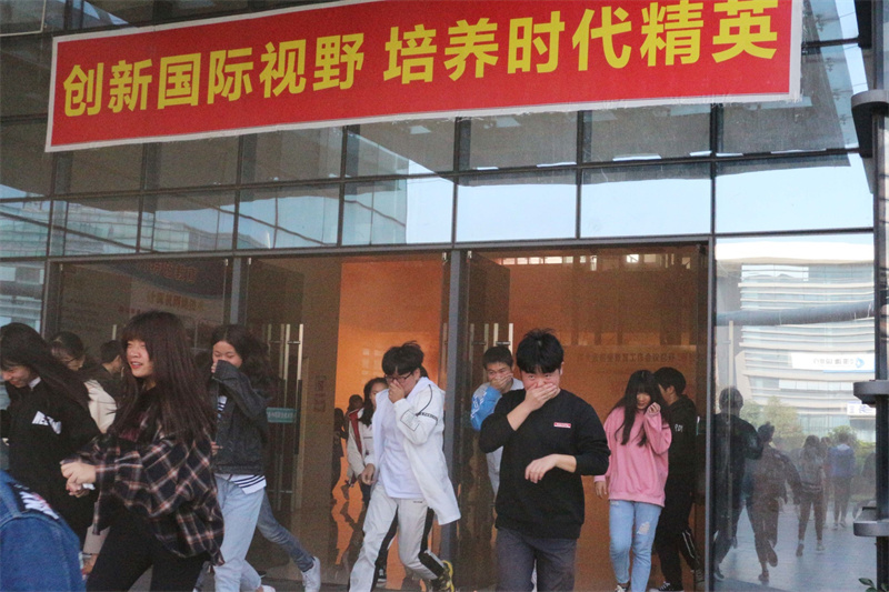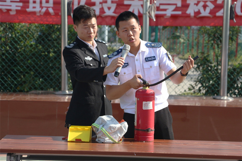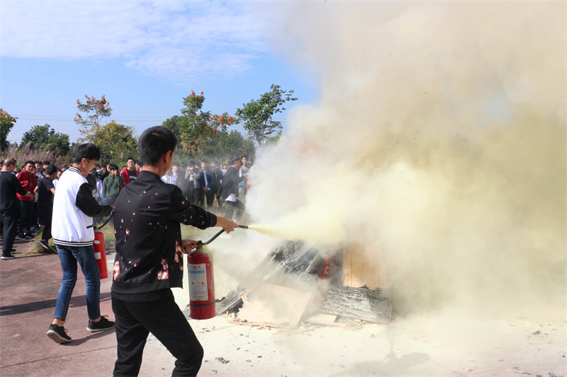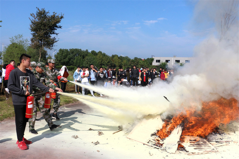 实践讲解中,教官对于火灾发生时,如何应用消防逃生面具与灭火器材进行现场演示,并指导学生进行现场操作,让学生真正掌握消防操作技能。