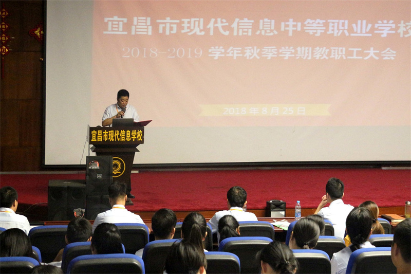 朱宗桥校长做训前动员讲话。他带领教师们重温党的教育方针:坚持教育为社会主义现代化建设服务、为人民服务,把立德、树人作为教育的根本任务,全面实施素质教育,培养德智体美全面发展的社会主义建设者和接班人,努力办好人民满意的教育。并提出现代信息学校应当承担起三大教育责任:“重师德,抓培训,提待遇”。朱校长勉励教师们应学高为师,身正为范;应不断学习,勇于创新,加强团队协作,树立服务意识;学校进一步改善教师福利待遇,做幸福的人民教师。承担起“培养时代精英”的教育使命,为实现自身价值和中国职业教育的进步做出努力。