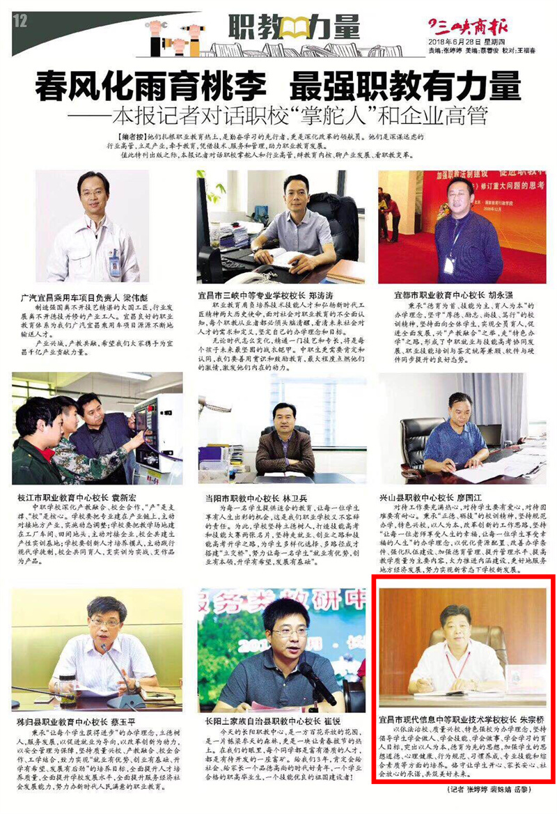 2018年6月28日,三峡商报的“职教力量”版块对宜昌职业教育事业进行专题报道,深度解读了宜昌职教的发展与力量,记者对话学校“掌舵人”。