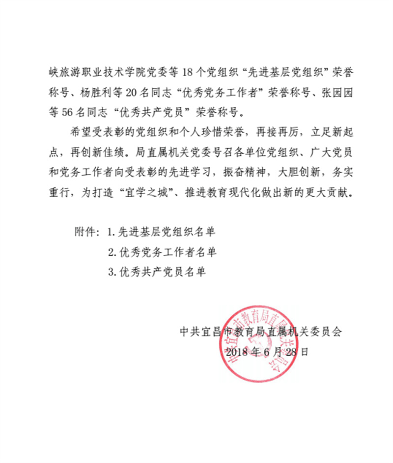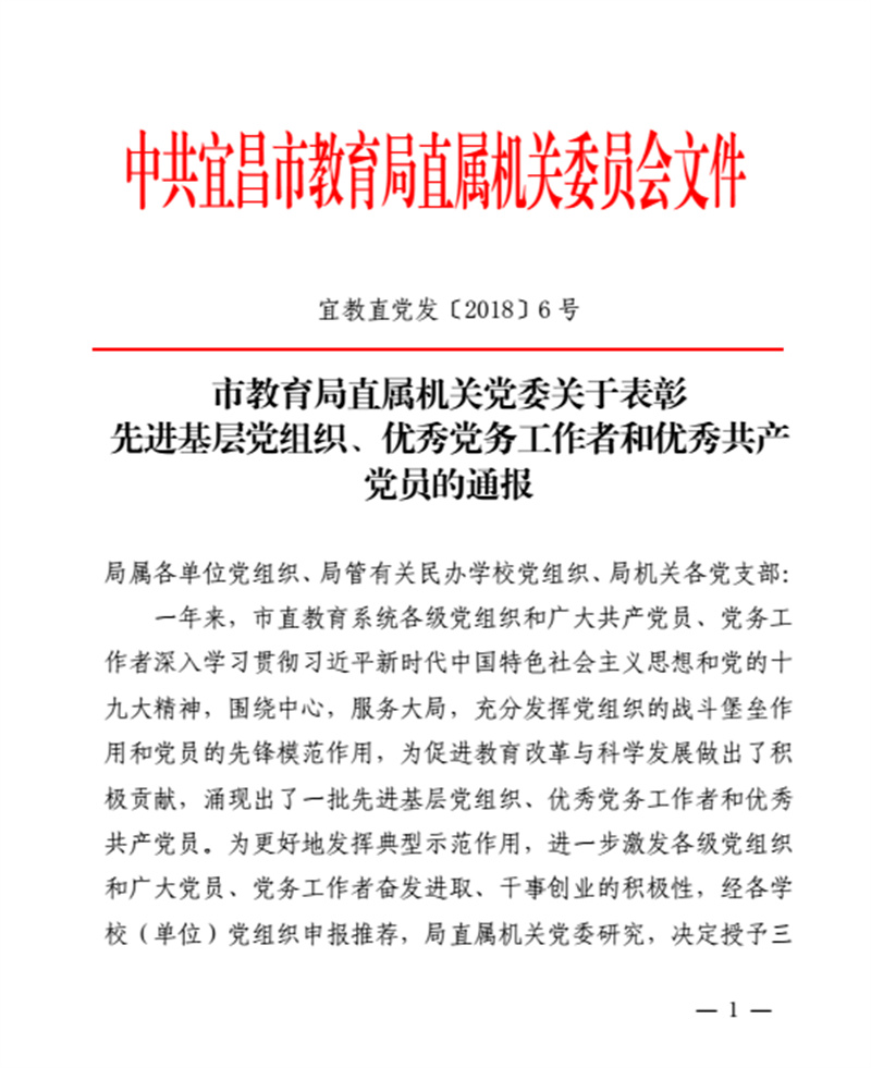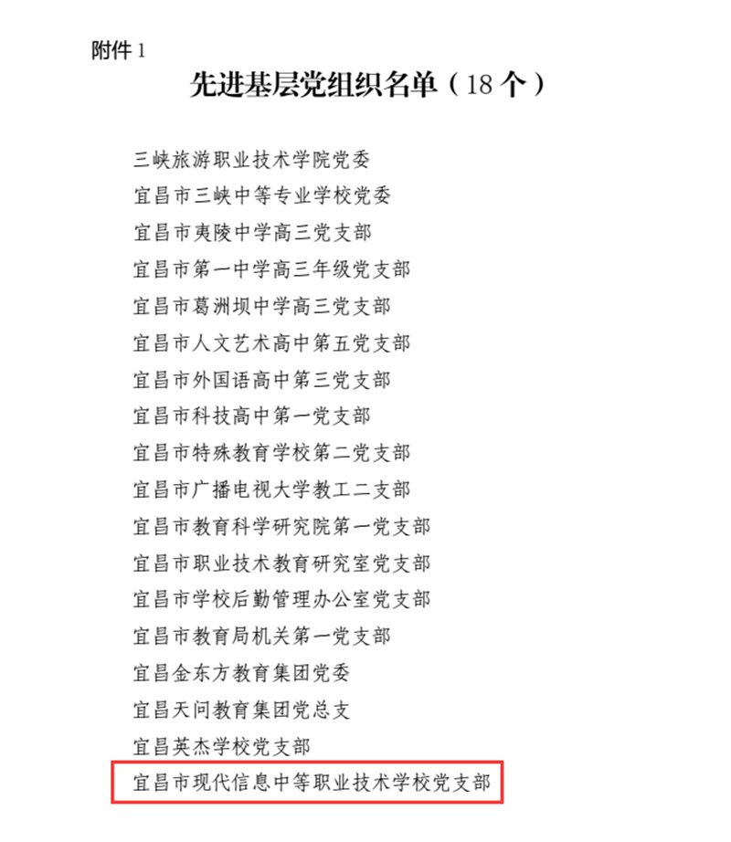 2018年6月28日,市教育局直属机关党委关于表彰先进基层党组织、优秀党务工作者和优秀共产党员的通报文件《关于表彰先进基层党组织、优秀党务工作者和优秀共产党员的通报》(宜教直党〔2018〕6号),宜昌市现代信息学校党支部被授予市级“先进基层党组织”荣誉称号,同时学校党支部书记田水荣同志被授予市级“优秀党务工作者”荣誉称号,党员肖飞同志被授予市级“优秀共产党员”荣誉称号。