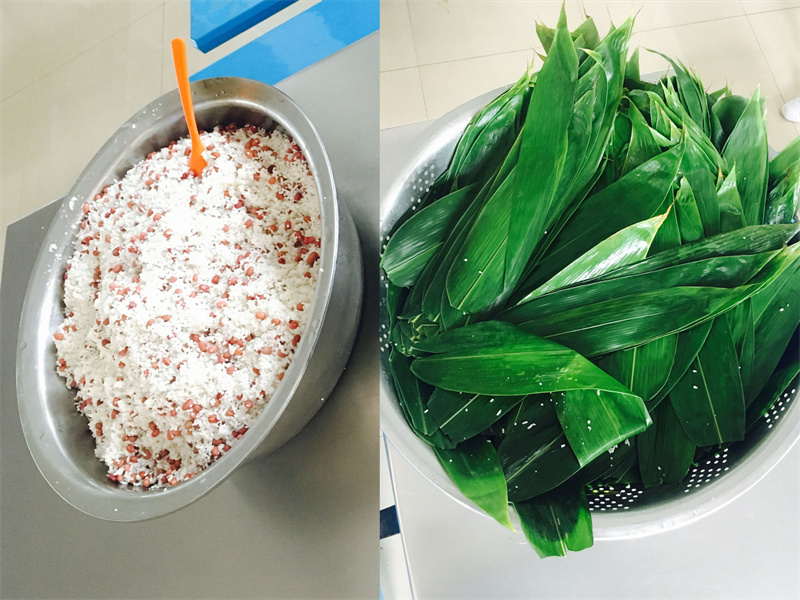 活动中,全体人员进行卫生消毒清洗,食堂阿姨准备了香喷喷的粽叶,泡好的白生生的糯米、黄豆、红枣等原材料。“把叶子稍微沾点水,这样它们就自然粘合在一起了,像这样把粽子变成一个圆锥形……”食堂阿姨和老师一边包粽子一边为学生们解说。学生一边听着包粽子过程的讲解,一边仔细地看他们如何折粽叶、放米粒、包粽叶、扎粽绳,进行包粽子的学习。