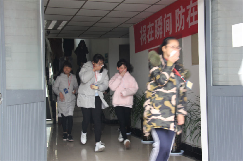 学生捂住口鼻进行疏散演练