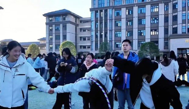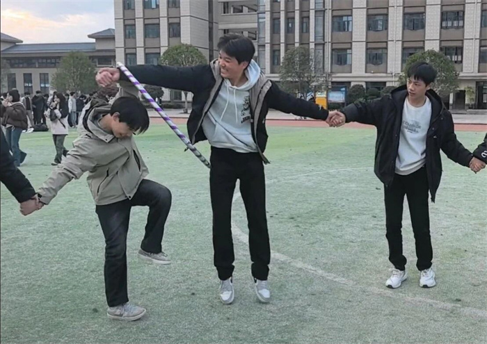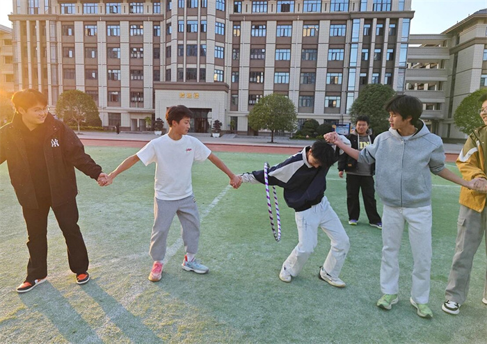 同学们手拉手围成圆圈,呼啦圈在彼此间灵巧传递。不靠言语,仅凭眼神交流和肢体配合,大家同心协力,在默契配合中顺利地完成了呼啦圈“接力”。