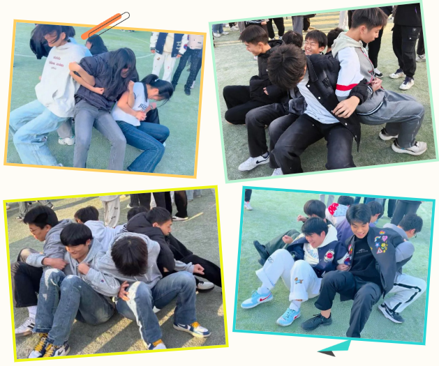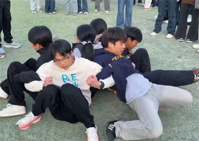 六名队员背靠背坐下,手臂紧紧相挽。哨声响起,同学们在一次又一次尝试中保持步调一致、相互借力一同站立。暖心的鼓舞和成功后的笑容,是对团结最生动的诠释。