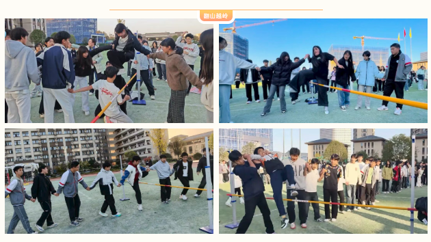 同学们手拉手依次跨越横杆,若有失误,全队都会停下等待,陪伴同伴重新开始。没有催促,只有此起彼伏的“加油”声。在这里,有同学甘愿成为踏板,为其他同学提供帮助,他们在携手前行中学会了不抛弃不放弃,懂得了协作是团队前行的保障。