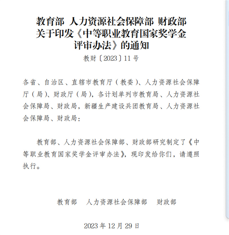 中职国家奖学金由中央财政出资设立,是中等职业教育领域的重要奖项,旨在奖励中等职业学校二年级及以上全日制在校生中特别优秀的学生,奖励标准为每生每年6000元。根据教育部、人力资源社会保障部、财政部联合印发的《中等职业教育国家奖学金评审办法》(教财〔2023〕11号)文件要求,我校严格遵循公平、公正、公开的原则,认真组织开展政策宣传、申请受理、资格审核、综合评审等工作。