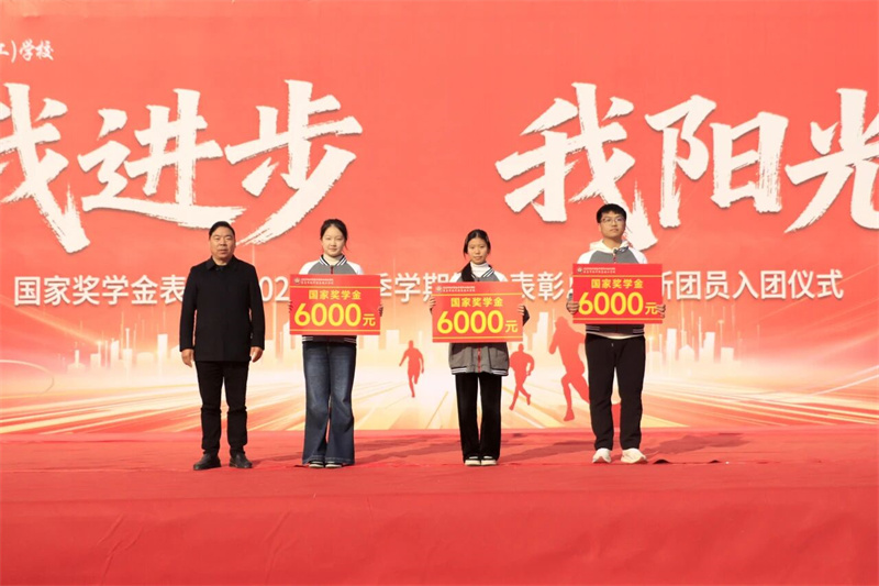 大会在庄严的升国旗、奏唱国歌仪式中拉开帷幕。随后,表彰环节有序展开,各类奖项逐一揭晓。国家奖学金作为重磅奖项率先颁出,2302班周景阳等3名品学兼优的学生,凭借优异成绩与突出表现,每人获得6000元奖励。田水荣书记为获奖学生颁奖并合影。
