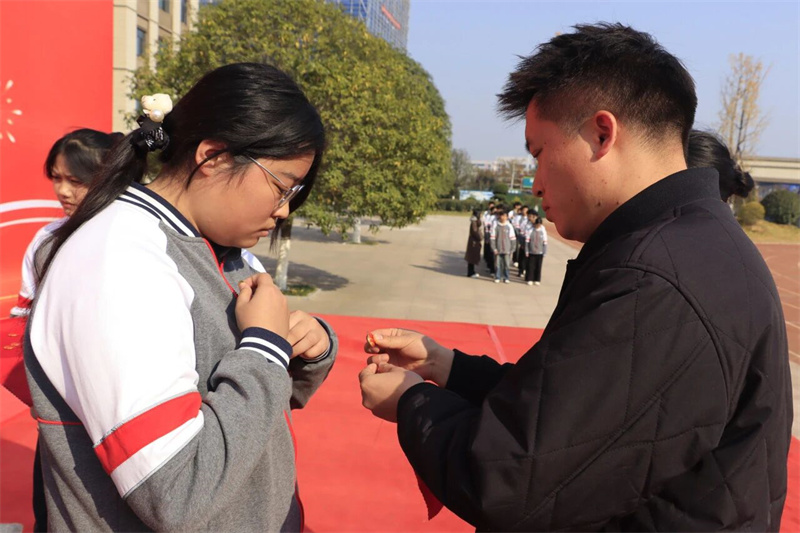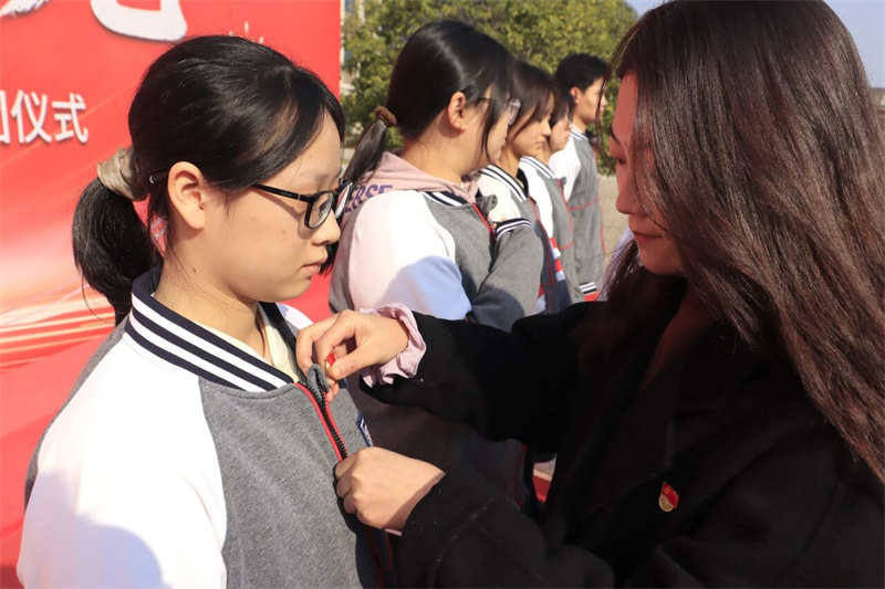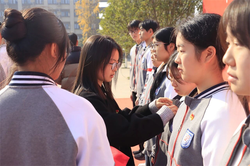 本次入团仪式由2302班团员代表黄梦娇主持。学校党员教师代表为新团员佩戴团徽,新团员集体宣誓,齐唱中国共青团团歌。老团员代表2307班杨曼漫同学上台发言,分享丰富的团组织生活,并对本次入团的同学表示祝贺。