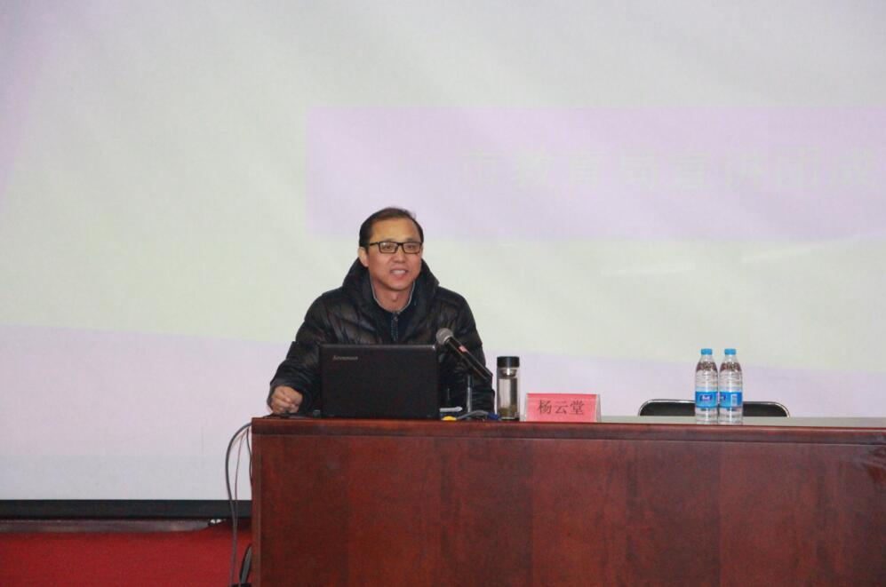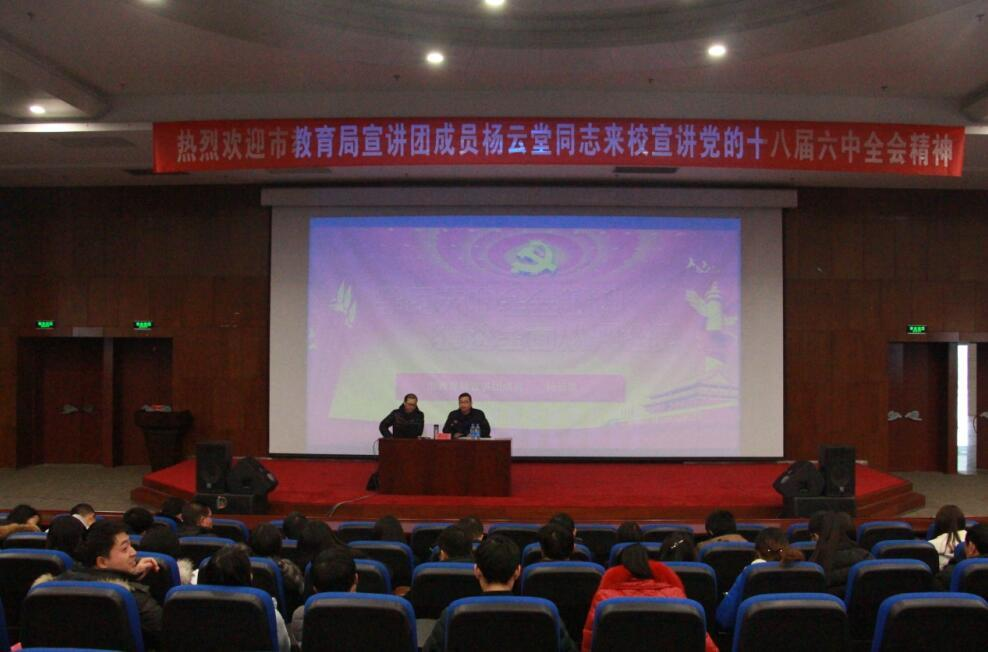 12月13日,市直教育系统宣讲团来我校宣讲党的十八届六中全会精神。报告会前,学校校长朱宗桥向杨云堂同志汇报了学校办学情况;会议由校党支部书记邓峰主持,学校全体教职工参加。市直教育系统宣讲团成员杨云堂作宣讲报告。