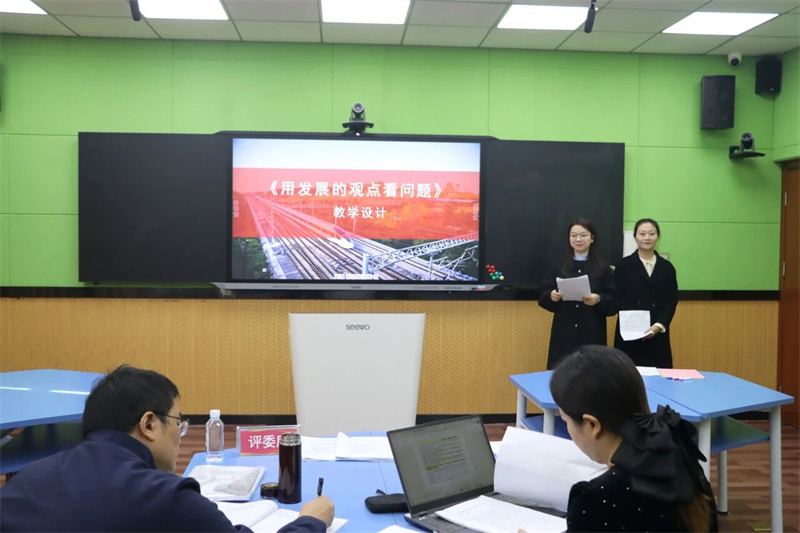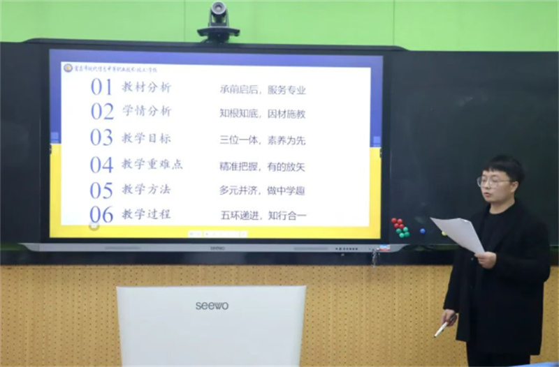 在备赛指导中,李琳玉院长以其丰富的参赛经验和专业见解,为教师们提供了系统而细致的指导。她不仅分享了往年参赛的成功案例,更针对每个教学环节可能出现的问题给出了具体建议。“教学设计的每个细节都关乎最终效果。”李院长从教学内容的选取、教学环节的衔接到课堂互动方式及教学反思撰写,均进行了细致分析。为了让指导更具针对性,李院长全程观摩教师说课展示,逐一点评并指出可改进之处,她特别强调“文化课要找准与职业场景的连接点,专业课要深化与行业标准的对接度”,这种一对一的精细指导,让参赛教师对比赛要求有了更准确的把握。