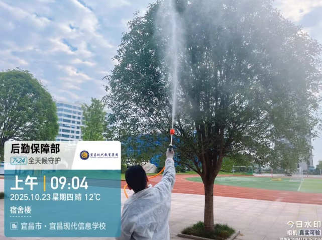 冬日里,蚜虫、红蜘蛛等害虫正潜藏在绿化树木枝干与缝隙中,准备越冬繁殖,若不及时防治,将影响来年树木生长活力。针对这一情况,后勤人员对校园内所有绿化树木开展喷雾防治作业。药剂选择严格遵循生态保护要求,在有效清除害虫的同时,不会对师生健康、土壤及周边环境造成影响,切实守护每一棵树木安全过冬,让校园绿意得以延续。