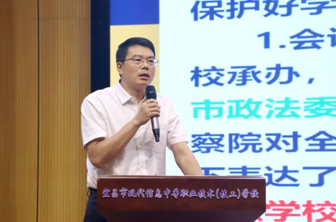 在交流发言环节,宜都市委政法委、当阳市教育局以及以我校为代表的相关中职学校依次分享了平安法治校园建设方面的经验与做法。宜都市委政法委以“聚焦精准,深化协同——筑牢平安法治校园坚固防线”为题,围绕“创新机制、精准供给、聚焦重点”三方面,介绍了完善“六位一体”未成年人保护体系的有效举措。当阳市职教中心重点汇报了健全“三线·三制·三位一体”育人机制,落实“四三四五”育人目标的精准策略。宜昌市三峡中等专业学校详细阐述了聚焦“手机、交友、欺凌、吸烟”四条红线,实施靶向施策、精准治理、多方联动的有效机制。我校校长吴昌钧以“筑牢立体防护网,守护职教平安园”为主题,从“物防升级、人防提效、制度防固本”三个维度,系统汇报了学校在校园安全治理方面的典型经验。