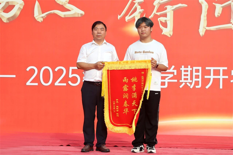 鲲鹏回归报春晖,锦旗熠熠映师恩。2205班赵陈哲作为优秀毕业生代表在发言中分享了苦与甜交织的高三生活,展现了榜样风采。他向学校敬赠刻有“桃李满天下,雨露润春华”的锦旗,表达对母校精心培育、老师辛勤付出的感激之情。董事长田水荣代表学校为他颁发了高考助学奖学金。一面锦旗,一份情谊,它承载着毕业生对母校的深深眷恋和无限感激,也见证了学校与学子之间割舍不断的深情厚谊。