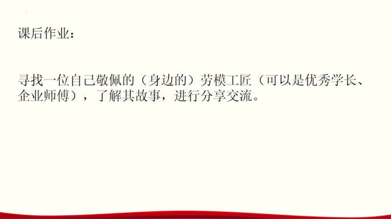 课程的尾声,叶婧老师以“寻找身边的劳模、工匠”为主线,布置了一份特别的作业,旨在将生活转化为第二课堂,引导学生在实践中进一步感受工匠精神的伟大,推动劳动精神、劳模精神、工匠精神在学生心中落地生根。