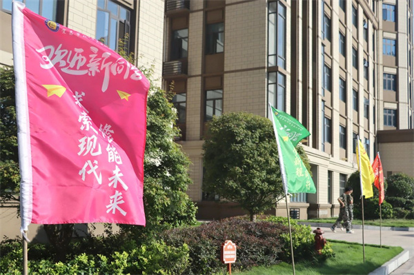 学校志愿者团队身着“志愿红”,教官团队身着“迷彩绿”,穿梭在校园内,指引、帮助萌新报到。教师团队身着“清新白”,后勤职工身着“热情橙”、“活力蓝”,坚守在报到工作一线,服务远道而来的学生与家长。