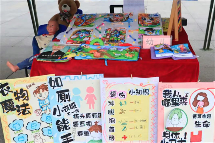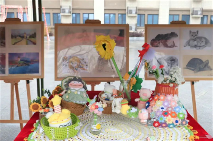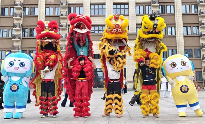 外场展示采用静态成果+动态展演结合形式,内容丰富、互动性强。航空服务、无人机、护理、幼儿、汽修等专业展区陈列实训设备与优秀作品,师生现场讲解演示;社团展区集中展示文创、书画等成果,吸引学子驻足体验。现场还有大型人偶吉祥物“现现”“代代”互动,舞狮、啦啦操、军体拳、古典舞等动态表演,热闹有序,全面呈现校园文化与办学特色。