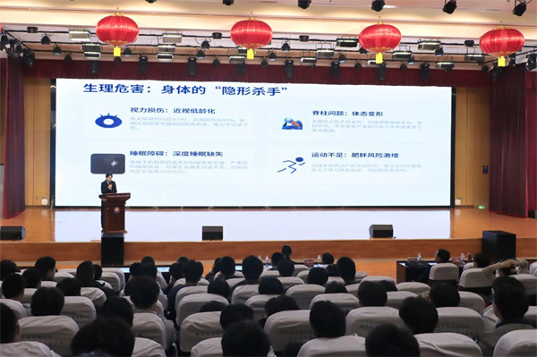 讲座围绕现状警示、危害剖析、风险防范、法律红线、协同守护五大板块展开。法治宣传员毛亚琪结合权威数据指出,当前青少年手机依赖问题突出,过度娱乐化使用已形成 “数字围城”。