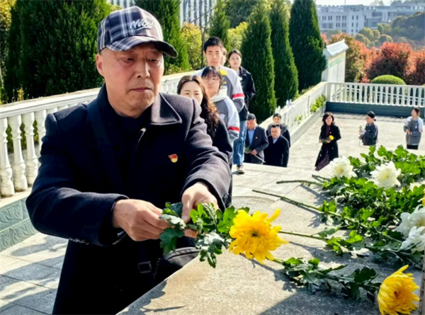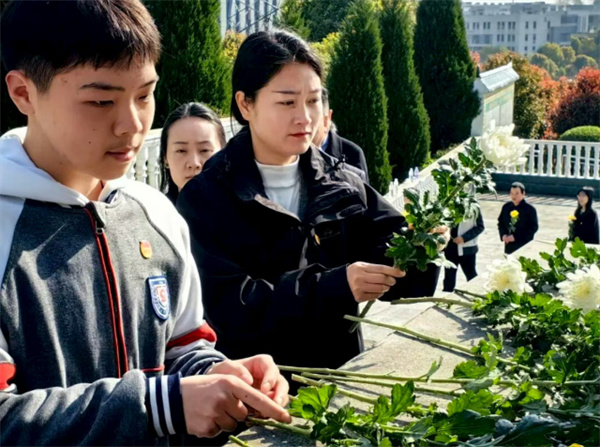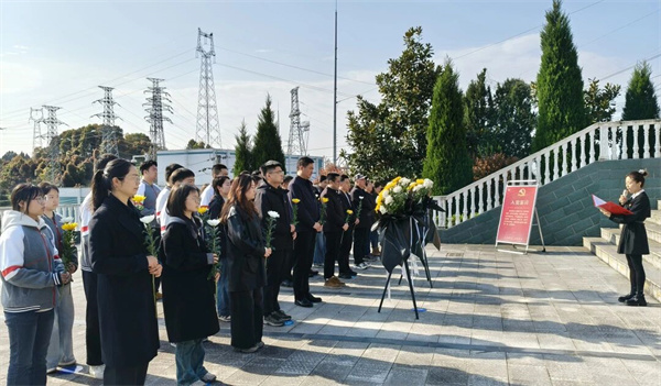 在敬献鲜花环节,党员教师与团员学生代表依次上前,将手中的黄白菊花轻轻摆放于纪念碑前,用朴素而庄重的方式表达对英烈的追思与缅怀。