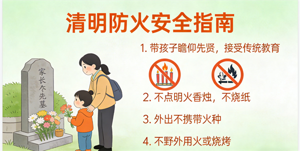 家长可以利用清明节这个传统节日,尽可能带孩子去瞻仰先贤,接受优秀传统教育,尽量不要点明火香烛,不要烧纸,严防火灾。外出游玩时也不要携带火种,更不能野外用火或烧烤,切实预防森林火灾的发生。