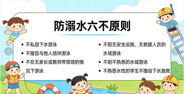 请家长和孩子一定要牢记防溺水安全常识,教育孩子做到“六不准”:不准私自下水游泳;不准擅自与他人结伴游泳;不准在无家长或老师带领的情况下游泳;不准到无安全设施、无救援人员的水域游泳;不准到不熟悉的水域游泳;不准不会水性的学生擅自下水施救。