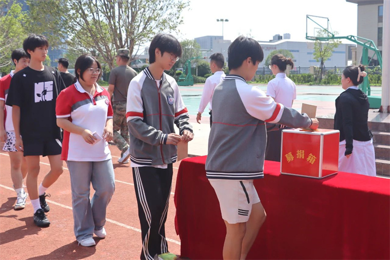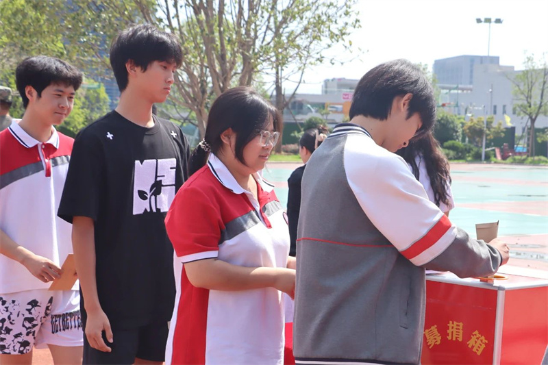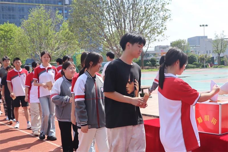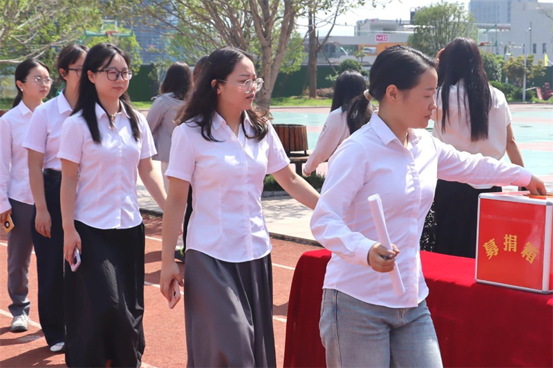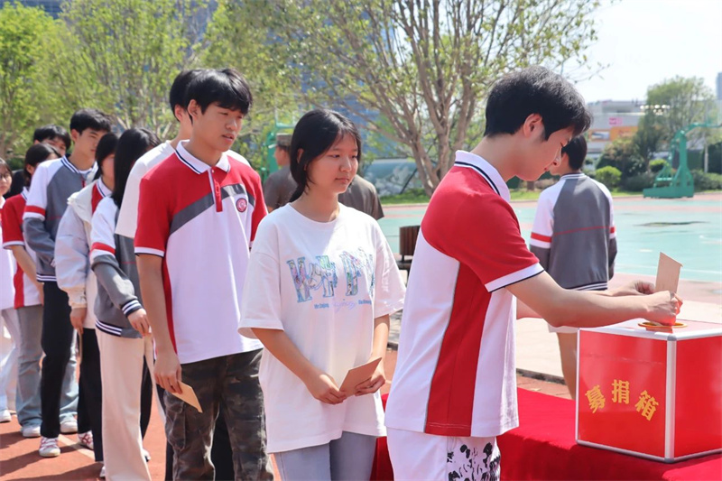 随后,各班学生代表依次上前捐款。代表们神情专注,郑重地将装有善款和祝福的信封投入捐款箱。当最后一份捐款投入完毕,现场随即响起热烈的掌声。