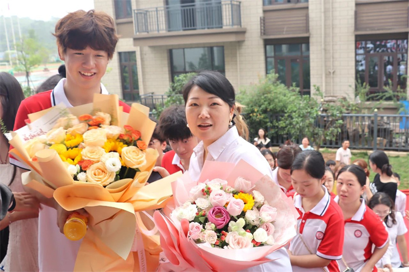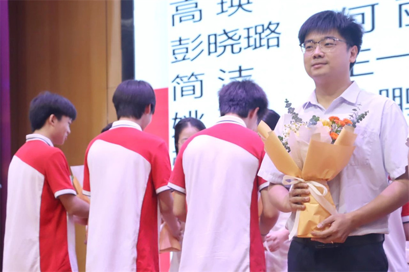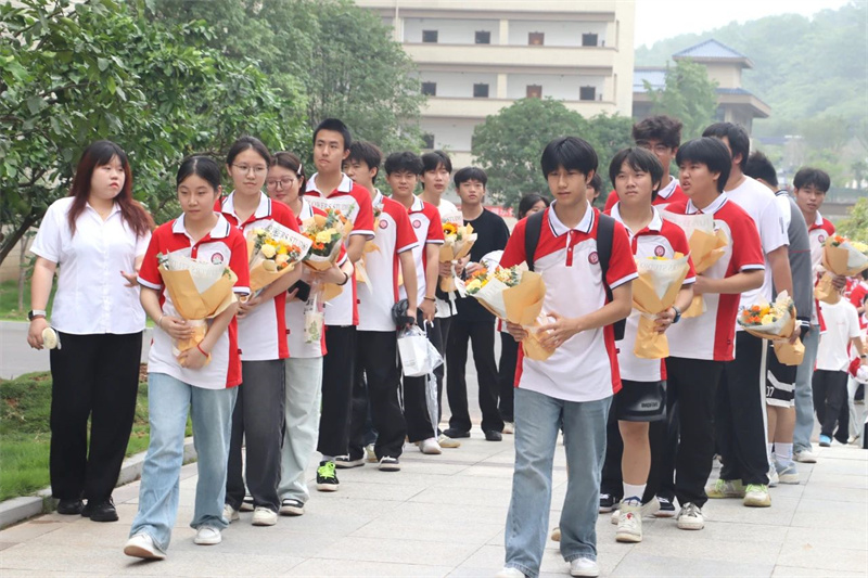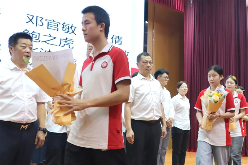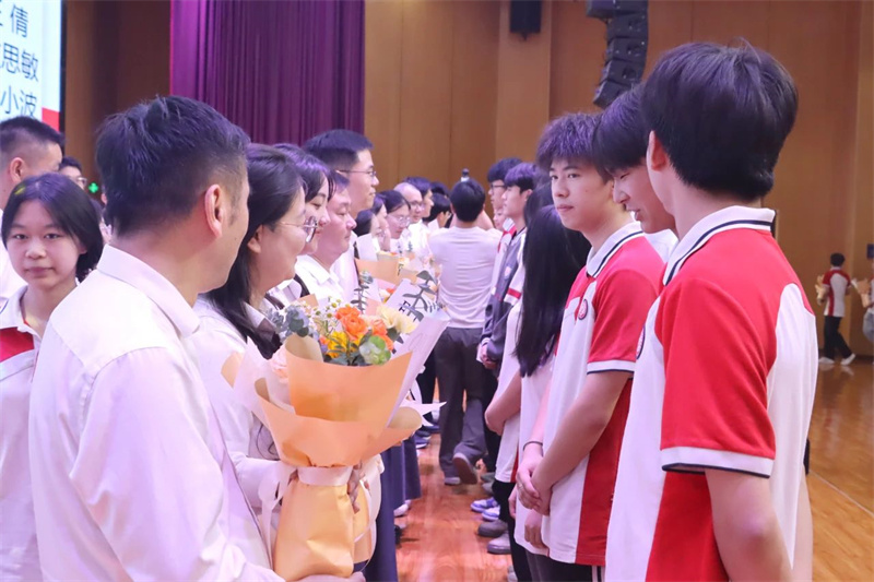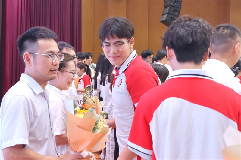 三尺讲台育桃李,一支粉笔写春秋。老师们不仅是知识的传授者,更是青春的引路人。学生的成长不仅有老师们的谆谆教诲,更离不开校领导们的关心与支持。从校园设施的完善,到学习平台的搭建;从生活细节的关怀,到未来方向的指引,他们用高瞻远瞩的目光,为我们铺就了这条通往梦想的道路。学生代表依次为校领导、高三教师献花。