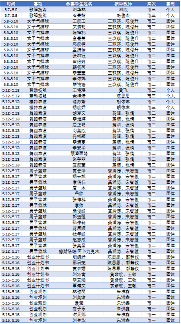 5.5月8日至13日,在学校的有序组织和教师的精心指导下,我校参赛队伍在歌唱技能、女子气排球、劳动技能、模特表演、舞蹈表演共获得两个团体二等奖、一个个人二等奖、五个个人三等奖。