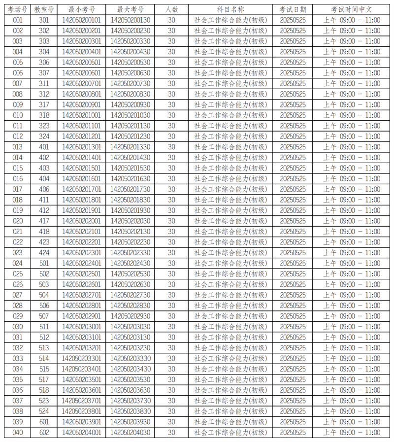 2025年5月25日 上午 9:00-11:00 社会工作综合能力(初级) 下午 14:00-16:00 社会工作务实(初级)
