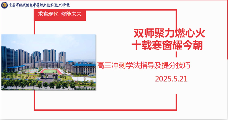 12.为助力学生科学备战技能高考,5月21日,宜昌市现代信息中等职业技术学校举办了一场以“精准施策,决胜高考”为主题的文化综合科目备考策略分享会。