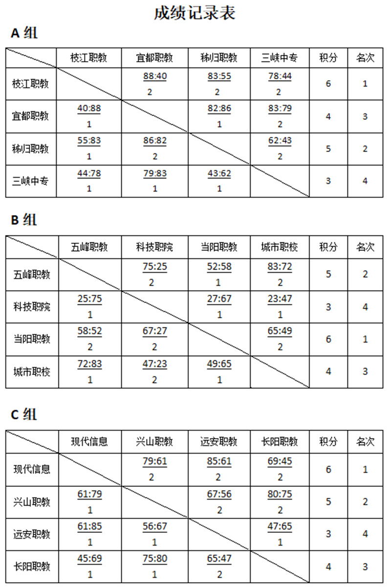 在5月12日至14日的第一阶段比赛中,各支队伍展开了激烈的小组单循环对决。经过18场充满激情与技巧的小组赛,枝江职教中心、现代信息学校、秭归职教中心、当阳职教中心、兴山职教中心、五峰职教中心、宜都职教中心、长阳职教中心球员们凭借出色的个人技能和团队配合,小组出线,入围八强。