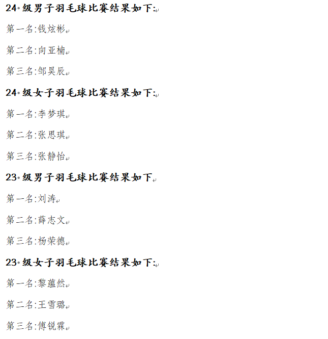 在羽毛球赛场上,选手们以轻盈的身姿和精准的扣杀赢得了现场观众的阵阵掌声。经过多轮激烈比拼,最终,来自24级的钱炫彬同学和23级的刘涛同学凭借出色的发挥,成功夺得年级男子单打冠军,而女子单打桂冠则由24级的李梦琪同学和23级的黎蕴然同学摘得。