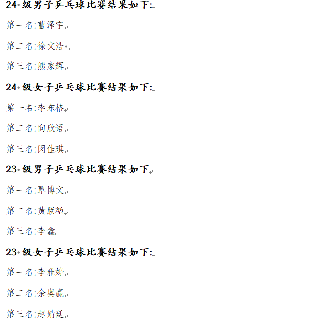 乒乓球赛场同样精彩纷呈。选手们用精湛的球技和顽强的毅力,为观众呈现了一场场扣人心弦的比赛。经过激烈角逐,24级的曹泽宇同学、23级的覃博文同学和24级的李东格同学、23级李雅婷同学分别获得了年级男子单打和女子单打的冠军。