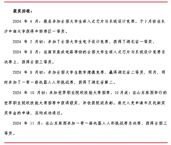 “在我的成长过程中,最为难忘的当属在现代信息学校求学的经历,最想感谢的是伴我奋进的老师们。高考前夕,专业课老师每日陪伴我们至深夜十点,悉心设计专项训练,细致讲解每一份试卷。陈国银老师在讲解C语言算法时,独特视角令我茅塞顿开,今年备战嵌入式芯片考试,遇Dijkstra最短路径算法难题,脑海中浮现陈老师授课思路,助我成功解题。文综老师们耐心十足,反复讲解考试重点,四处搜寻试卷供我们练习,并及时剖析错题。英语老师在单词记忆上为我提供启发,助力我找到适合自己的记忆诀窍。老师们倾囊相授,帮我们构建知识体系,提升应试技巧。他们牺牲休息时间,陪我们打磨错题,这种精神如种子深植我心,伴我进入大学。在各类竞赛与生活中,我坚韧面对困难,这份精神馈赠成为我人生路上宝贵的财富,持续照亮前行道路。”