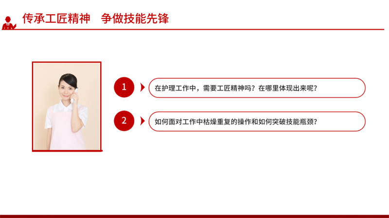 结合护理专业的特色,李老师还现场连线了宜昌市中心人民医院西陵院区妇科专科护士长李林。李护士长从自身经历出发,分享了她在护理工作中如何践行工匠精神,为患者提供无微不至的关怀。这一环节的设计,不仅让学生们对工匠精神的四大内涵有了更深入的理解,也激发了他们将来在护理岗位上发光发热的热情。