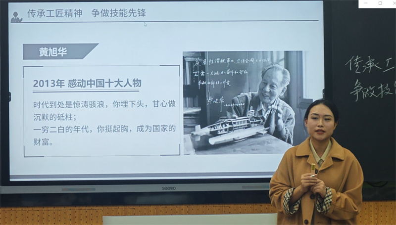 上课伊始,李老师巧妙地引入了感动中国年度十大人物——黄旭华先生的视频作为切入点。视频中,黄老先生一生致力于核潜艇事业,其敬业、专注、精益、创新的工匠精神深深打动了在场的每一位同学。李老师借此机会,引导学生们思考,在技能学习的道路上,我们同样需要这样的精神指引。