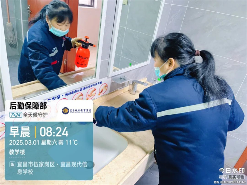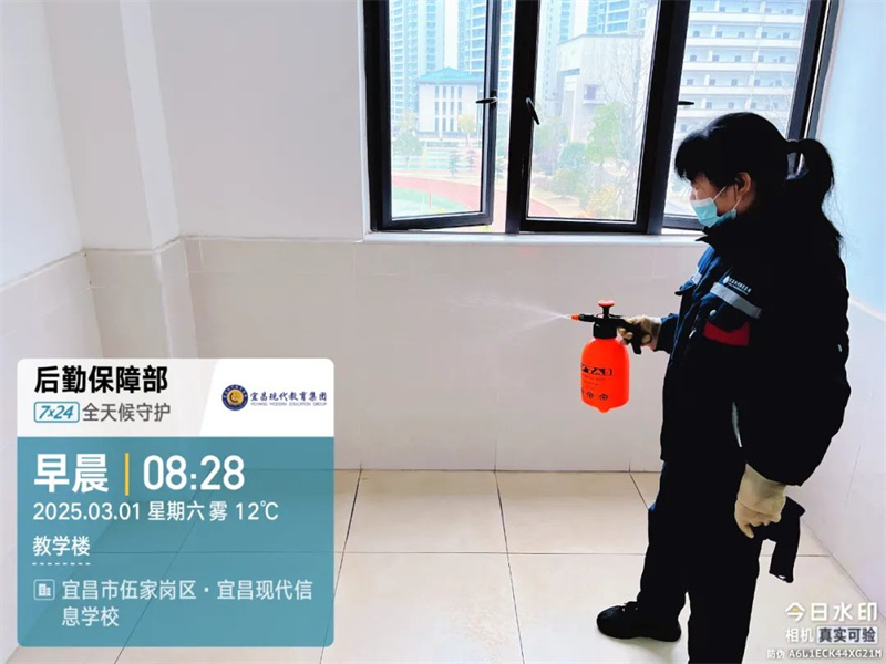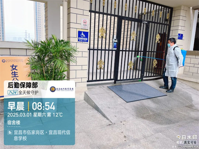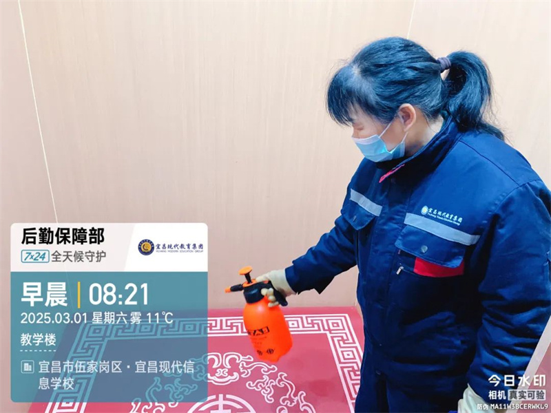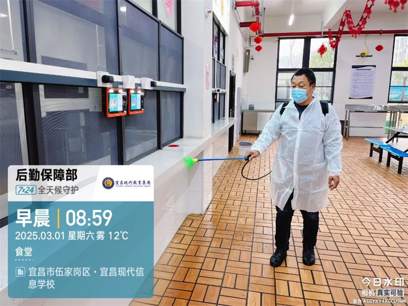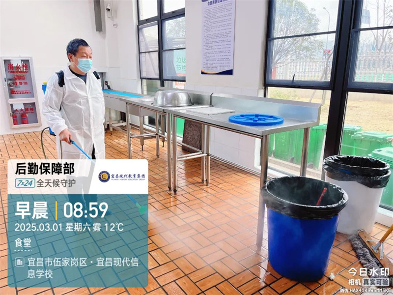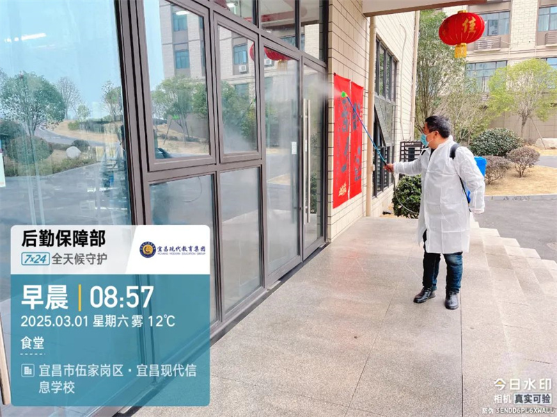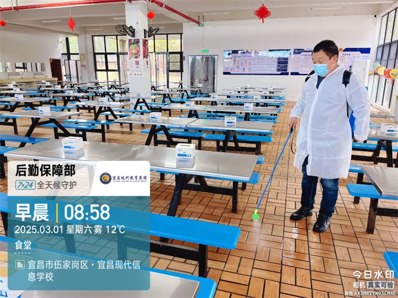 工作人员严格按照规范流程,身穿防护服、佩戴口罩,对教学楼、宿舍楼、食堂等各公共区域进行了全方位喷洒消毒,不放过任何一个角落,有效降低诺如病毒等春季常见流行疾病的传播风险。
