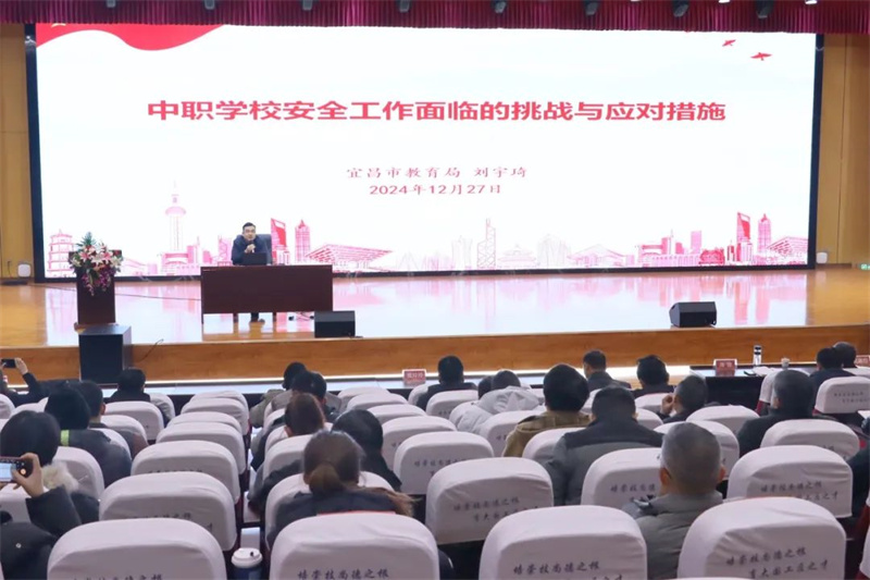 上午,宜昌市教育局公共事件应对科刘宇琦同志以“新时代中职学校安全工作面临的挑战与应对措施”为题,直面中职学校学生安全管理难题,从“学生异常行为及教育惩戒”“涉校事件的应对与处置”“心理健康教育及危机处理”“校园欺凌防范对策”“校园安全工作原则与策略”五个方面,深入剖析问题根源,结合自身多年安全管理工作经验,提出了切实有效的管理方法,对中职学校安全管理工作进行了深入系统指导。